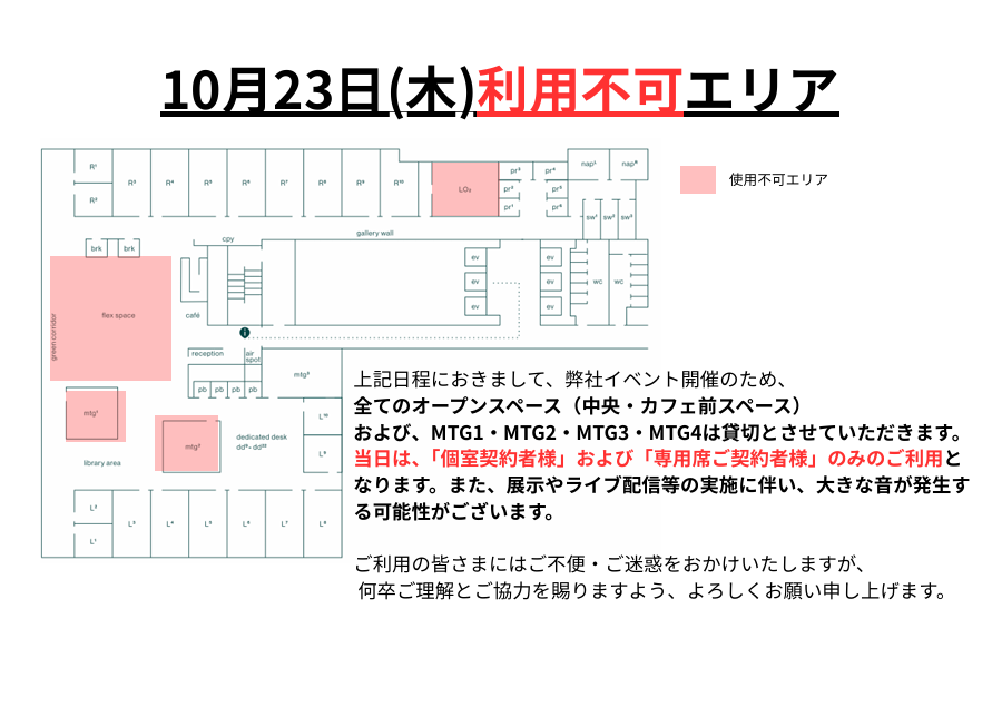 当日は、「個室契約者様」および「専用席ご契約者様」のみご利用いただけます。